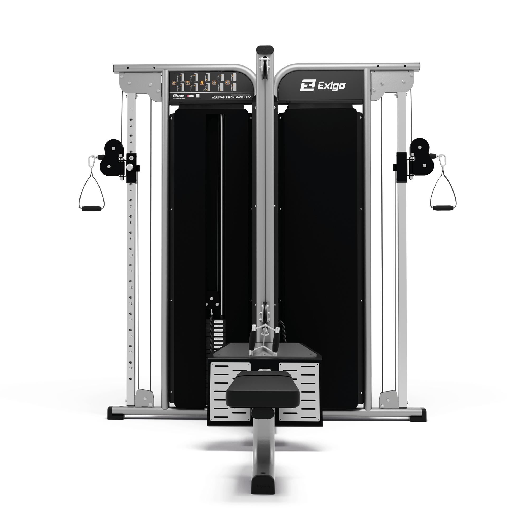 The Exigo 4 Station Jungle Gym is a great multi-functional and space saving solution that is made up of two High Low Pulleys, a Low Row, and a Lateral Pulldown. 5kg incremental weights allow precise resistance increases and numerous load options.
