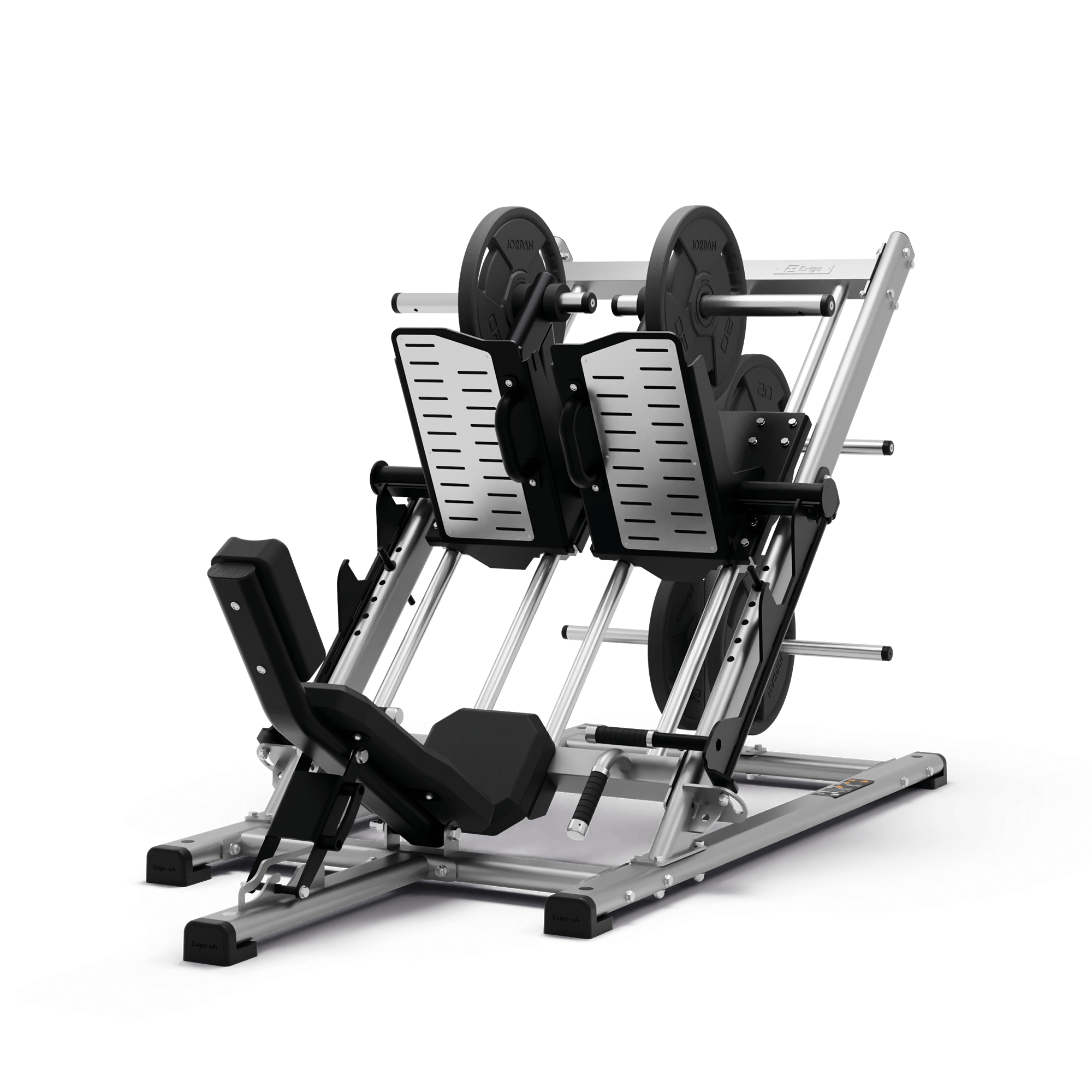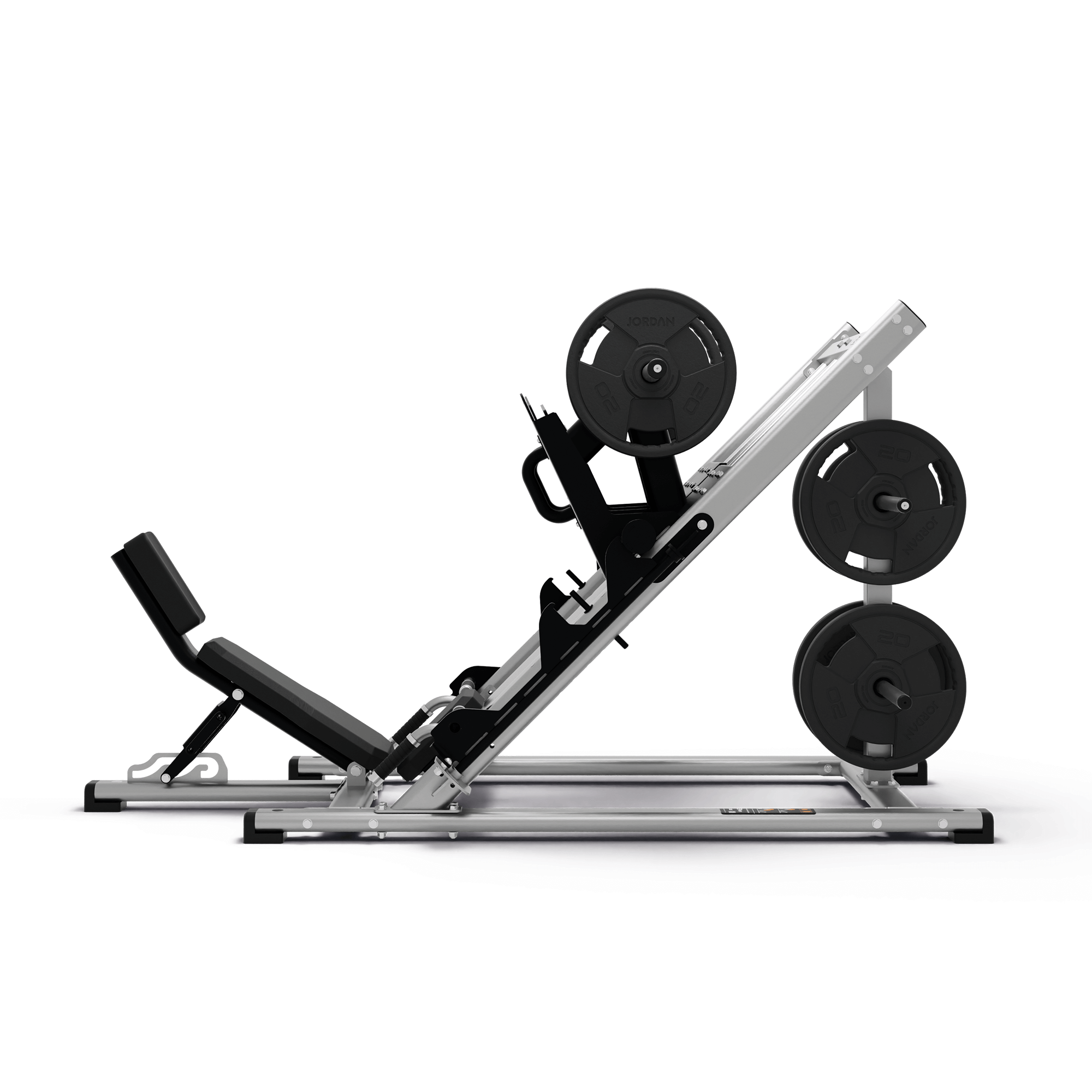 The Exigo Plate Loaded Dual 45 Degree Leg Press effectively builds the quads and is designed with a carriage that can be split or joined to allow the user to train each leg separately or simultaneously, as well as loading different weights on each side if necessary. It features adjustable safety pins for varied exercise depth as well as stainless steel anti-slip footplates, premium 40mm linear bearings, and a 3-position back pad for optimum performance and comfort.