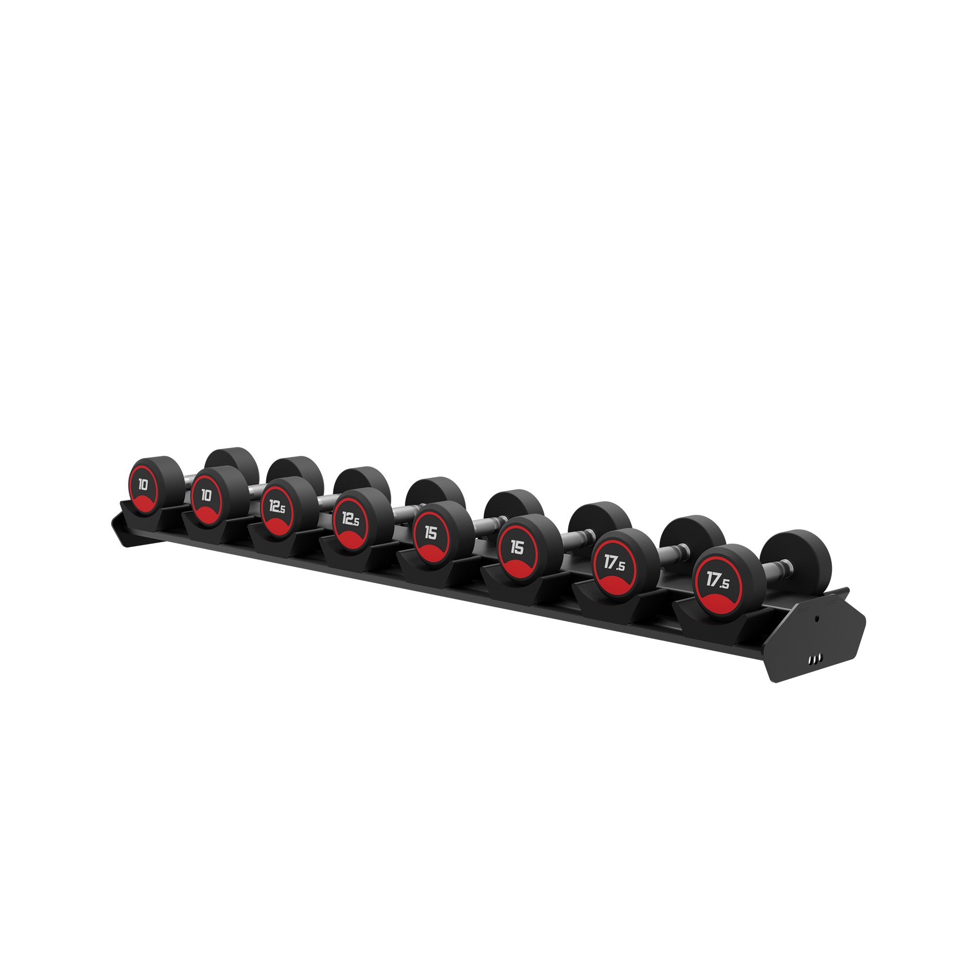 The Exigo Dumbbell Rail is available in two sizes and is designed to securely store dumbbells within a storage bay or rack.