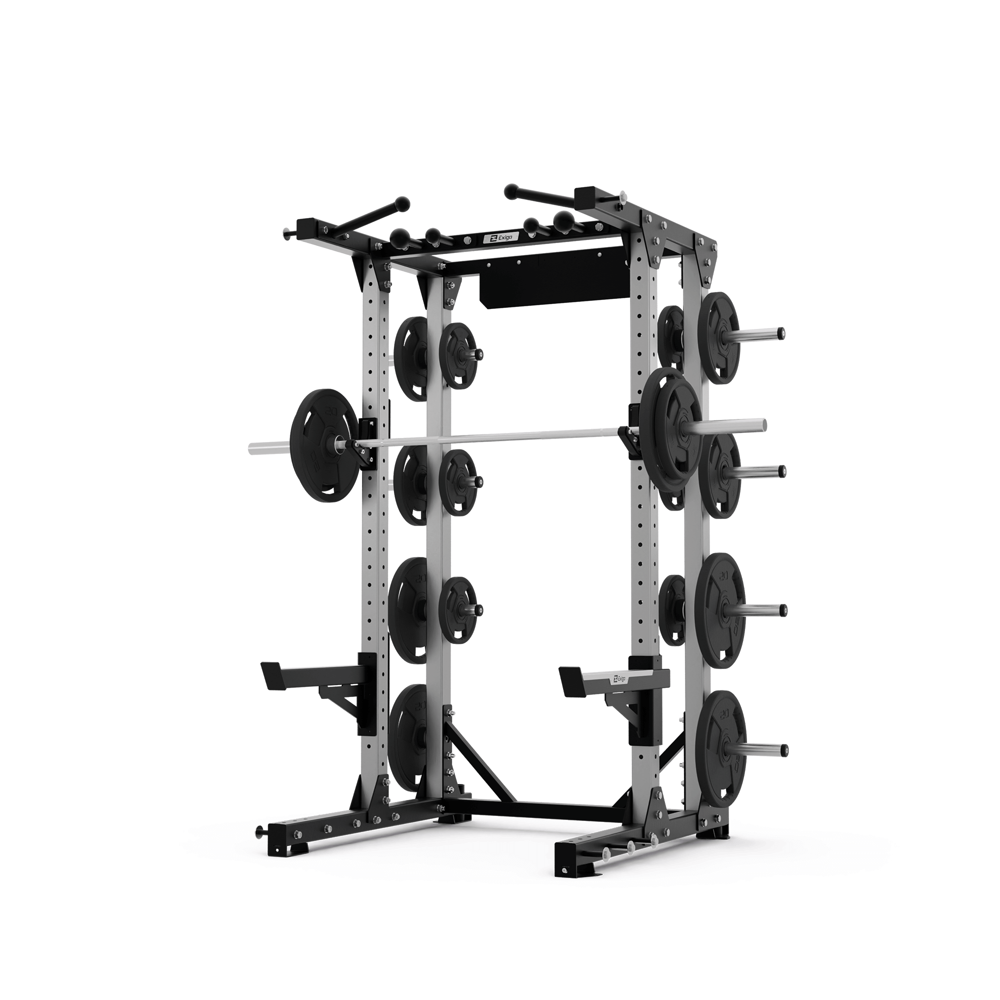 The Exigo E80 Elite Half Rack has 4 pull-up options and includes J-Hooks, Safety Spot Arms, Band Pegs, Weight Horns, and Bar Storage as standard.