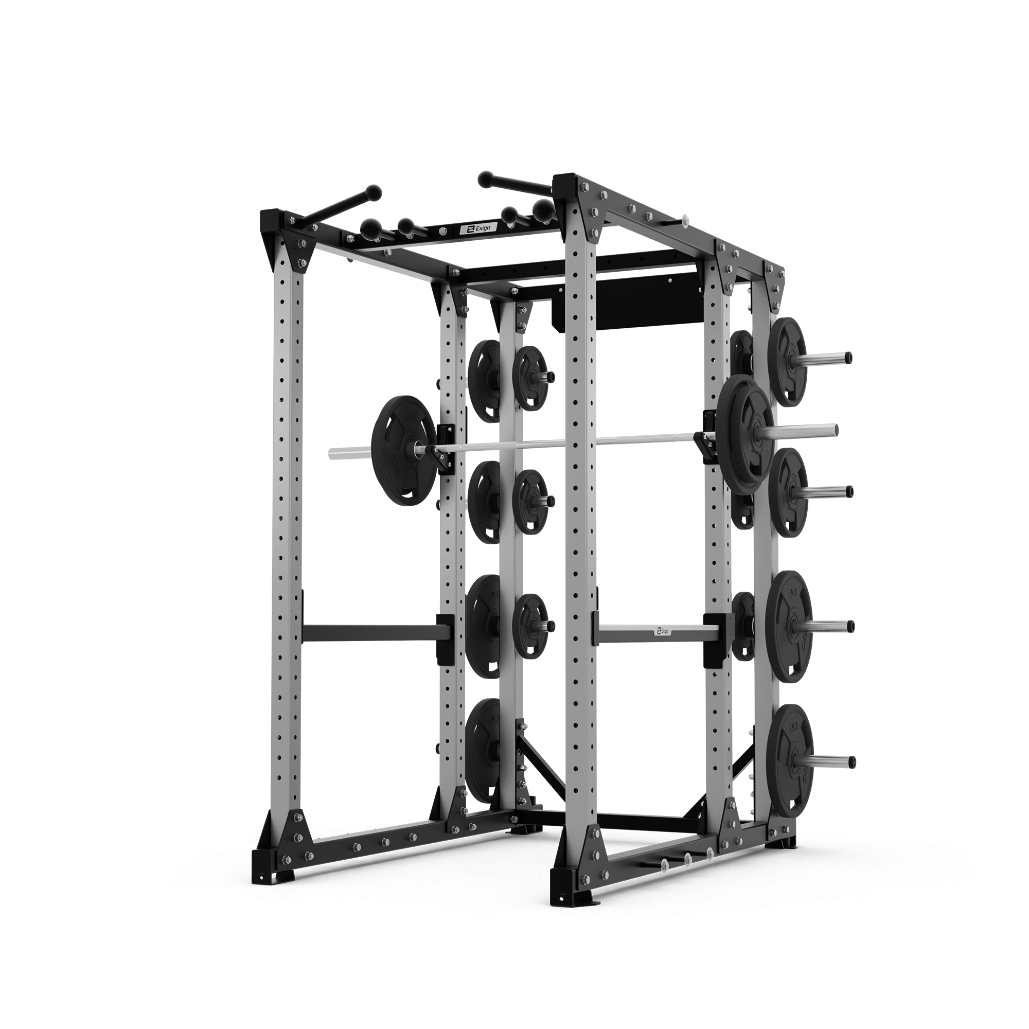 The Exigo E80 Elite Power Rack has 4 pull-up options and includes J-Hooks, Internal Safety Spot Arms, Band Pegs, Weight Horns, and Bar Storage as standard.