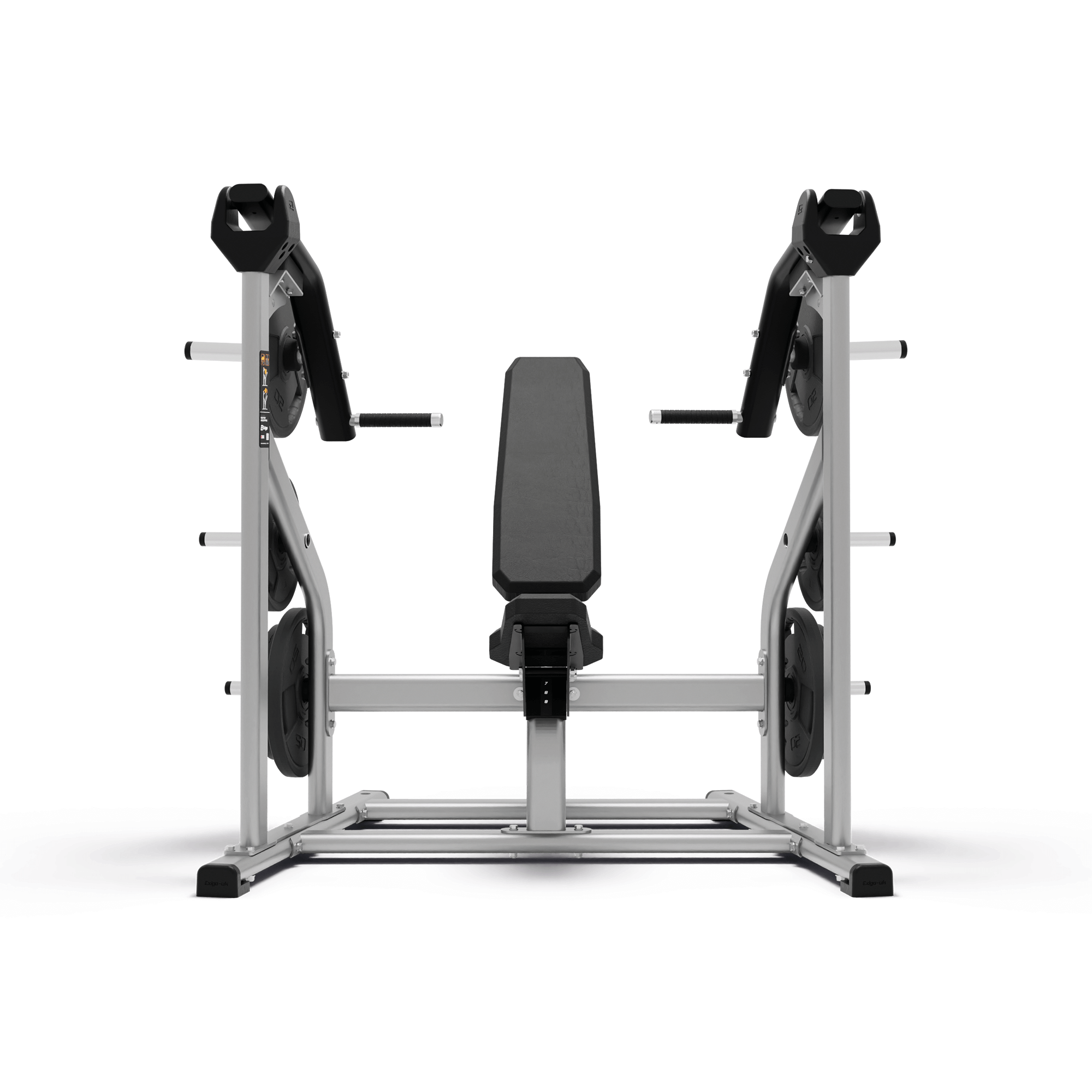 The Exigo Plate Loaded ISO-Lateral Front Pivot Shoulder Press targets the deltoids and is designed with an angled back pad for improved stability during heavy loads and to also discourage hyper extension of the spine. Independent arm movements allow the user to train each limb simultaneously or separately, as well as loading different weights for each limb if necessary. 38mm rubber ribbed handles provide great comfort and feature caped anodised aluminium ends for additional protection. Optional chrome storage horns with high impact ends are also available to provide storage for weight plates.