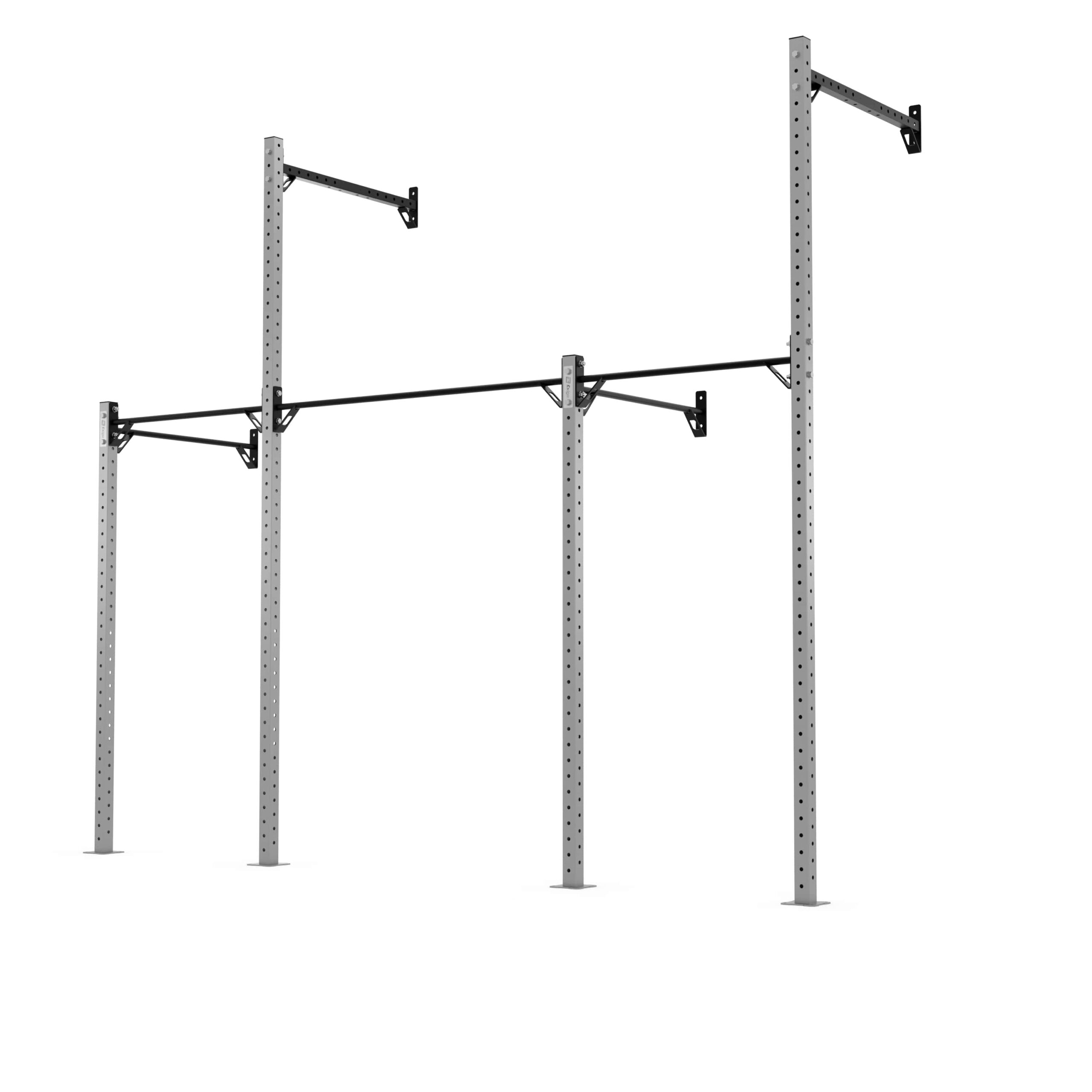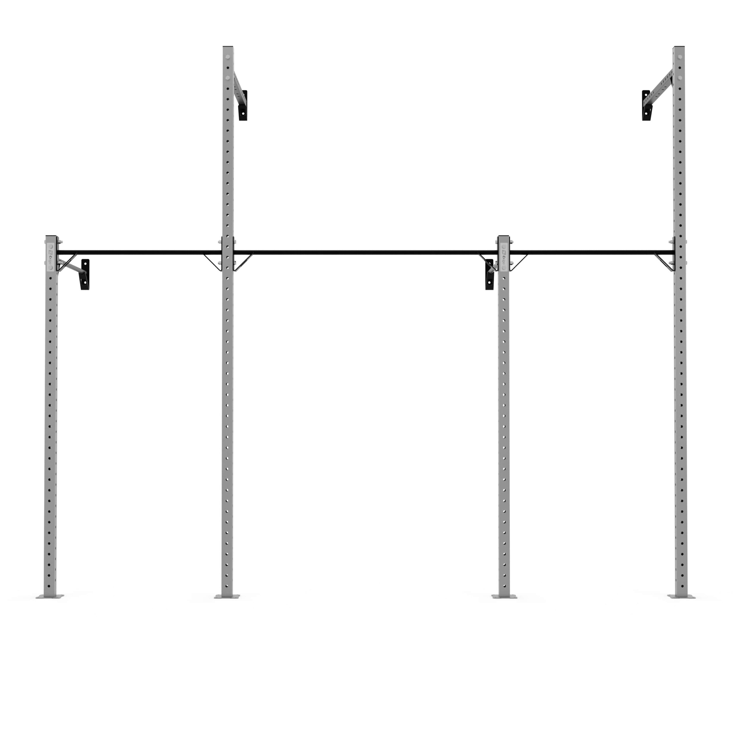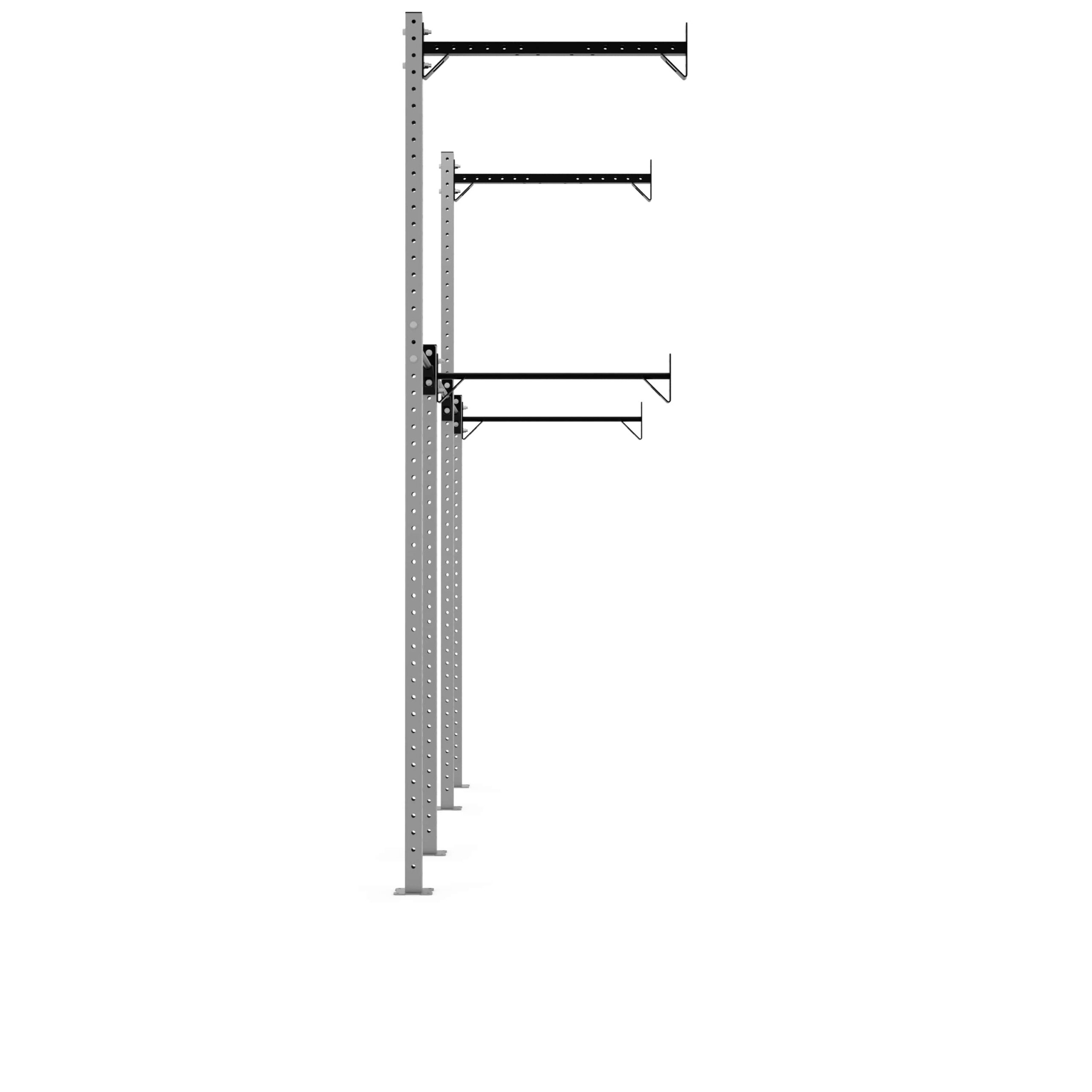 The Exigo X70 2 Bay High/Low Wall Rig is secured to the wall and floor to help make better use of space and features 3.7m tall uprights to attach trawler arms for Olympic rings or climbing ropes. This modular frame can be used as a standalone unit or as a starting point that can be expanded over time. Enhance the base unit with our large range of attachments to provide athletes with various training options. As standard this rig also includes 3 pull-up points suitable for muscle-ups, and can accommodate up to 2 squat stations.