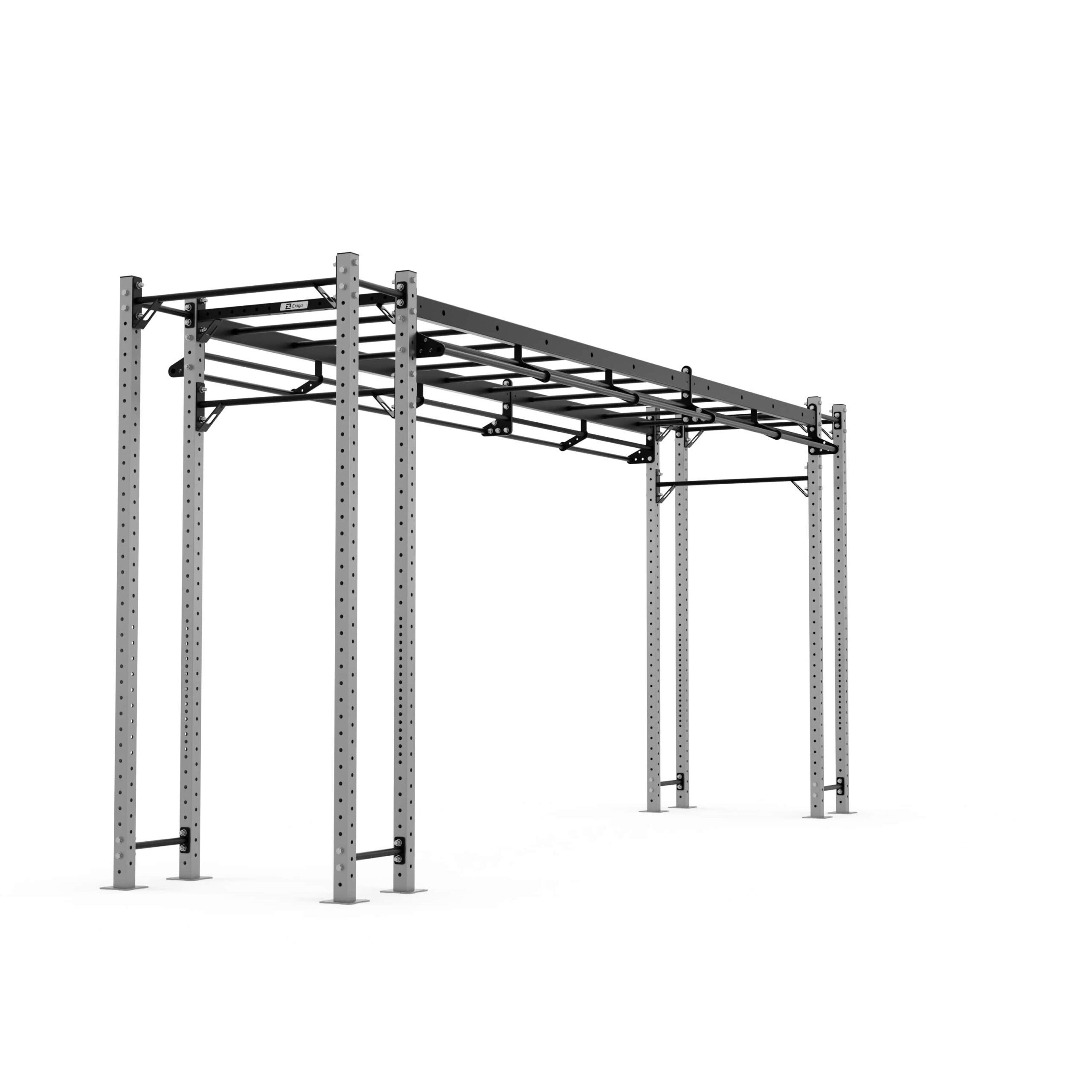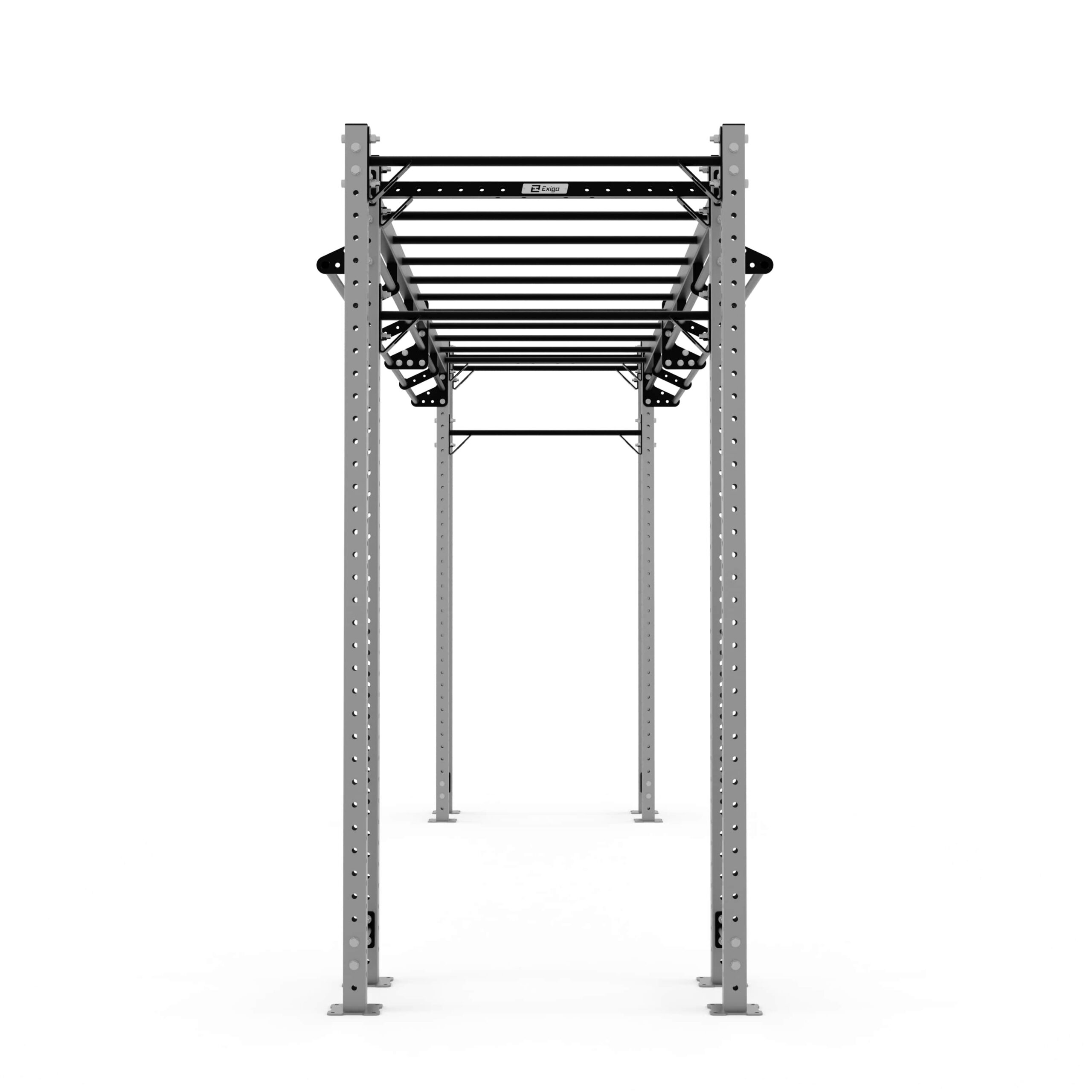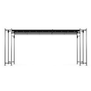 The Exigo X70 Bridge Rig is available in several spans up to 10 metres and is ideal for various group functional fitness sessions and body weight workouts. This open format frame is designed to maximise your training area while retaining valuable floor space. Configure the base unit with our large range of attachments and storage shelves to create a system that meets your needs and engages members. The 6m Bridge includes a monkey bar run plus 12 pull-up points suitable for muscle-ups, and can accommodate up to 2 squat stations facing inwards or outwards.