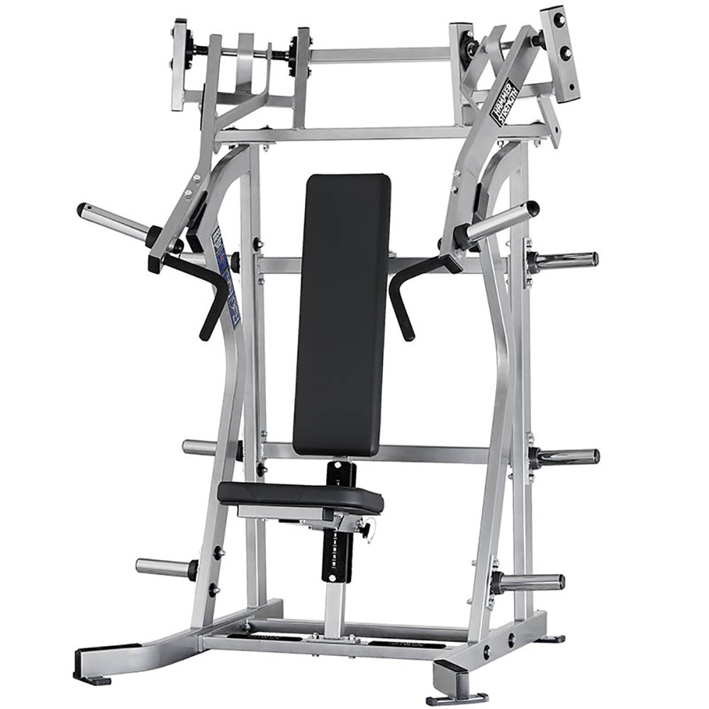 The Plate-Loaded Iso-Lateral Incline Press was blueprinted from human movement. Separate weight horns engage independent diverging and converging motions for equal strength development and muscle stimulation variety. Horizontal grips simulate a traditional bench press machine for comfort.